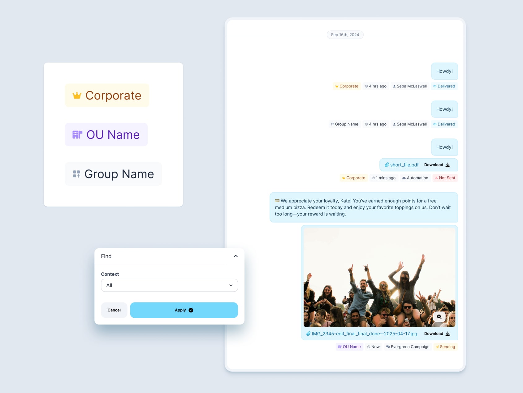 Contacts page is getting an aggregated message timeline that can show all franchise-level messages no matter the context. In order to make this work we need to display the origin of each message. These badge types bring the design and component from Forecast Dashboard work to these new views.